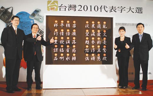 她指出,今年候選的40個代表字多具祥和的正面力量,但“亂”字依然連續(xù)三年入圍。她透露,遠東集團董事長徐旭東選的代表字是“新”字,理由包括:ECFA創(chuàng)造“新”契機、“新”市場、花博展現(xiàn)的華人力量讓全世界耳目一“新”、“五都”選舉將展現(xiàn)“新”面貌等。黃晴雯自己則選“愛”字。