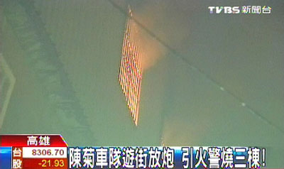 中新網(wǎng)11月24日電 據(jù)臺灣“中廣新聞”報道,民進黨高雄市長候選人陳菊23日傍晚到高雄縣梓官鄉(xiāng)車隊掃街拜票,支持者和車隊沿途猛放鞭炮,沖天炮四處亂竄,結(jié)果,飛沖到光明路一家電子專賣店三樓,導致這家電子專賣店三樓失火,火勢并且迅速延燒到隔壁兩間民宅的三樓,消防局出動七輛消防車前往搶救,近一小時才將火勢完全撲滅。