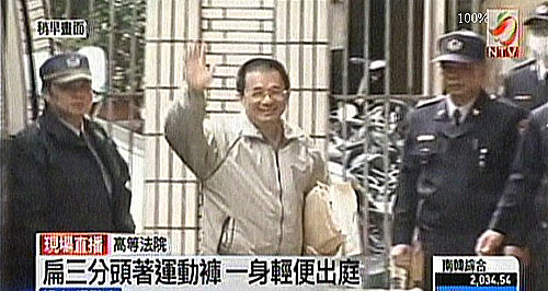陳水扁手上拿著黃色牛皮紙袋裝的卷宗,露出微笑并向在場媒體揮手致意,在戒護人員陪同下快速步入高院。
