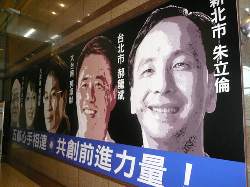 國民黨當(dāng)初為因應(yīng)“五都”選舉,特別在中央黨部1樓大廳兩側(cè)張貼巨型的“五都”市長候選人看板,訴求“‘五都’心手相連,共創(chuàng)前進(jìn)力量!笨窗迳,新北市長候選人朱立倫、臺(tái)北市長候選人郝龍斌、臺(tái)南市長候選人郭添財(cái)、高雄市長候選人黃昭順、臺(tái)中市長候選人胡志強(qiáng)的照片一一呈現(xiàn)。