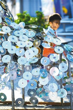 中新網11月8日電 據臺灣《聯(lián)合報》報道,午后陽光泄照下,臺中市綠園道上,由廢光盤片所組合的裝置藝術,吸引了路人的注目,也讓人感受到廢物利用的美意。