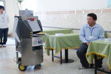 據(jù)臺灣媒體報道,這部點餐服務(wù)機器人,身高一百五十厘米,臺灣勤益科大電子系黃國興教授帶領(lǐng)四名同學以一年時間完成。機器人有臉部辨識系統(tǒng),有客人上門,就會主動打招呼,機器人會查看哪里有空位,規(guī)劃最佳路徑,帶領(lǐng)客人到達指定桌號,再透過觸控、聲控的方式進行點餐,并將點好的菜單利用無線網(wǎng)絡(luò)傳送到柜臺、廚房。