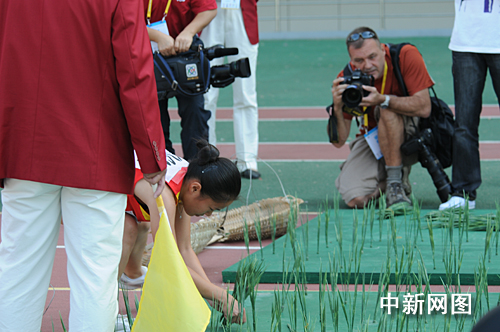 中新網(wǎng)泉州10月28日電 (劉通)今天上午,第六屆全國農(nóng)民運動會田徑項目在福建泉州海峽體育中心開賽。圖為專注采訪農(nóng)運60米插秧比賽的兩名外國記者。