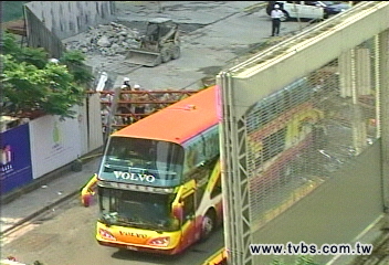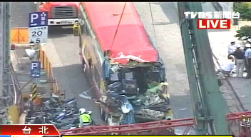 臺北市信義區(qū)松高路工地一架起重機(jī)從37樓高墜落砸中游覽車尾部,車上坐著25名廣東旅游團(tuán)團(tuán)員,當(dāng)時(shí)他們用完午餐打算前往101大樓參觀,沒有想到意外從天而降,游覽車車體已經(jīng)變形。