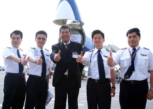 華航五月十五日派出747-400貨機(jī)直飛成都,成為兩岸人道救援包機(jī)的首航記錄,四名機(jī)組人員起飛前比起大拇指。(“中央社”圖)