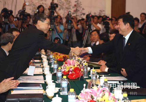 6月12日上午,海峽兩岸關系協(xié)會副會長孫亞夫(右)與臺灣海峽交流基金會副董事長高孔廉在北京釣魚臺5號樓協(xié)商兩岸周末包機。中新社記者 任晨鳴 攝