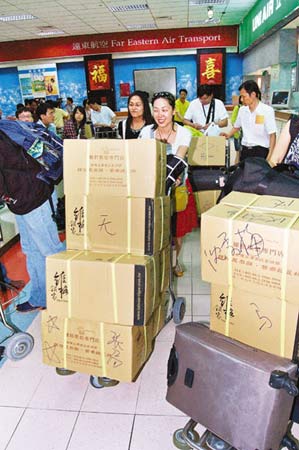 而當(dāng)天下午第一個(gè)在松山機(jī)場(chǎng)立榮航空柜臺(tái)報(bào)到的南京團(tuán)旅客,行李就超重9公斤,航空公司地勤人員、大陸領(lǐng)隊(duì)及臺(tái)灣導(dǎo)游都傻眼。丁海洋表示,希望臺(tái)灣方面能夠簡(jiǎn)化行李托運(yùn)手續(xù),提供行李托運(yùn)優(yōu)惠。
