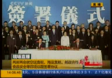 中新網(wǎng)臺(tái)北11月4日電 據(jù)本網(wǎng)記者從現(xiàn)場(chǎng)發(fā)回的消息:大陸海協(xié)會(huì)會(huì)長(zhǎng)陳云林與臺(tái)灣;鶗(huì)董事長(zhǎng)江丙坤今天下午14時(shí)許在臺(tái)北就兩岸海運(yùn)、空運(yùn)、郵政、食品安全等議題簽署四項(xiàng)協(xié)議。