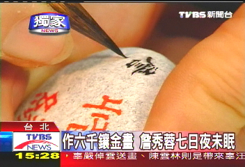 中新網(wǎng)11月4日電 臺北“江陳會談”今天舉行,臺灣;鶗䴗蕚淞髓傆6000金字的“和平協(xié)商,共創(chuàng)雙贏”的藝術字畫,送給陳云林。據(jù)臺灣TVBS報道,字畫創(chuàng)作者、臺灣藝術家詹秀蓉透露,為了這幅字畫,她不眠不休花了7天時間,才在最后一刻完成。不過,見證兩岸歷史時刻,詹秀容說,她與有榮焉,所以分文不取。