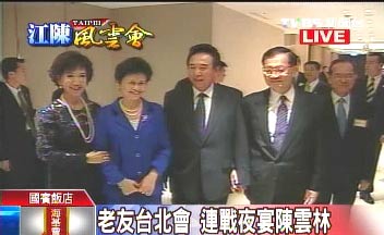 對(duì)于應(yīng)連戰(zhàn)之邀,與政界、業(yè)界人士共享晚餐,身負(fù)重任的陳云林心情顯得很好,不僅笑容滿面,進(jìn)場(chǎng)時(shí)還不斷揮手與在場(chǎng)者致意。