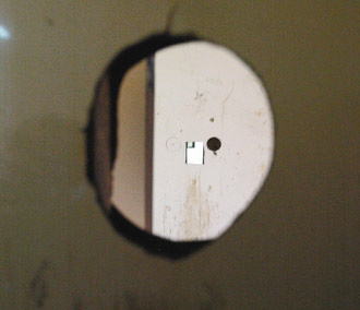 戲院的廁所,除了小號(hào)使用的便斗外,有五間“大號(hào)”的坐式廁所,每間都以很薄的三夾板作隔間,從地面算起木板上約一百厘米的高度處,都被挖了一個(gè)洞,較大的直徑約十五厘米。