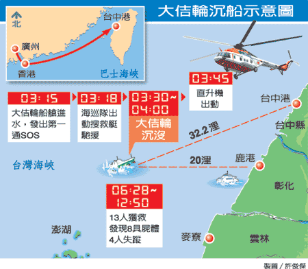 據(jù)臺(tái)灣《中國(guó)時(shí)報(bào)》報(bào)道,香港到臺(tái)中港的航線,平常很好航行,但正值冬季東北季風(fēng),風(fēng)浪較大,十四日凌晨更有十一級(jí)陣風(fēng),增加航行的危險(xiǎn)性。臺(tái)中海巡隊(duì)表示,該輪這次是載運(yùn)花崗碎石來(lái)臺(tái),極可能貨艙沒有用帆布蓋好密合,或是貨艙有破裂,致打到甲板上的海浪,流進(jìn)貨艙,造成貨輪下沉。