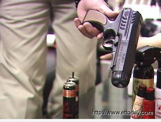 防身器材業(yè)者陳慈美表示:“這個叫做辣椒噴霧槍,它們噴出來的距離是5公尺到7公尺,噴出去的話是直線形,然后再擴散,有點淺咖啡跟辣椒那種紅色的顏色出來。”