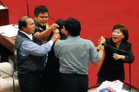 中新網(wǎng)4月9日電 據(jù)“中央社”報道,臺北市“議會”8日發(fā)生“議員”口角,市“議員”楊實秋(中背對鏡頭)認為鄰座的莊瑞雄(左二)干擾他發(fā)言,雙方爆發(fā)口角,眾“議員”紛紛趕來勸架,在“議長”宣布休息后才結(jié)束紛爭。