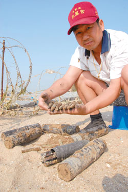 昨天下午,金門民眾在浯江溪口一帶看到距離建功嶼不遠(yuǎn)的海灘上,似有一些大小不一的長條狀東西,走近一看赫然都是未爆彈。民眾趕緊用水桶將它們裝起來。