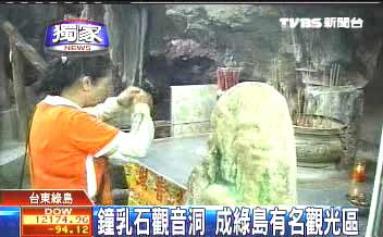 中新網(wǎng)6月18日電 據(jù)臺灣TVBS報(bào)道,綠島有個鐘乳石洞,里面有一座石筍,樣貌很像一座觀音,當(dāng)?shù)孛癖姺Q為“觀音洞”,相傳多年前,有一名婦人來這里拜拜求子,果然成功,故事不斷流傳,后來越來越多人相信,有從臺中、高雄來,還有從基隆來,他們數(shù)十個人包船或搭機(jī)來,現(xiàn)在觀音洞,已經(jīng)成了綠島知名的觀光地區(qū)。