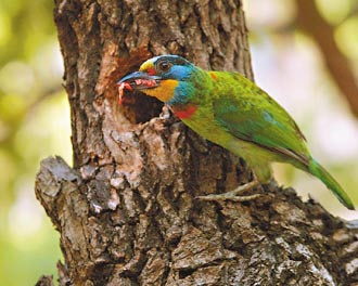 據(jù)介紹,五色鳥在臺北士林官邸、植物園也會偶現(xiàn)蹤跡,不算少見。但臺大醫(yī)院旁的這棵樟樹旁剛好有電線,供成鳥歇息,增加賞鳥機會。樟樹上頭可見約十厘米的木洞,五色鳥屬啄木鳥科,特別喜歡在樟樹的枯干上挖洞筑巢。