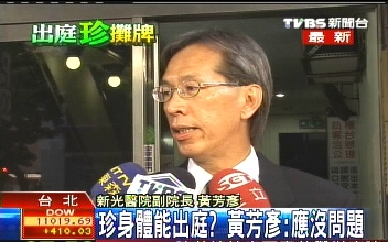 據(jù)臺(tái)灣TVBS報(bào)道,黃芳彥說:“法院的準(zhǔn)備都很好,我想都有萬全的準(zhǔn)備,因?yàn)槲也皇撬闹髦吾t(yī)師,所以病情我也不了解,也不便多透露,我是她的家庭醫(yī)生,而她的病需要?漆t(yī)生來照顧,我想法院也會(huì)以主治醫(yī)師的意見為意見!