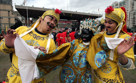 據(jù)“中央社”報(bào)道,表演藝術(shù)研究所師生穿上傳統(tǒng)服飾,演出媽祖出巡祈福劇目。其中,飾演“黑面媽祖”與護(hù)駕的三位同學(xué)更以“俏皮”扮相博得喝彩。(黃自強(qiáng))