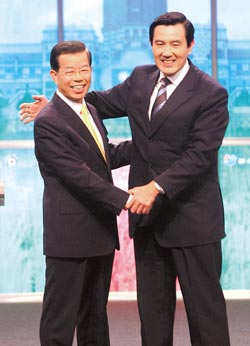 ·組圖:謝長(zhǎng)廷與馬英九首場(chǎng)電視辯論 握手致意