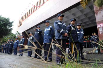 臺(tái)北地方法院29日開(kāi)庭審理陳水扁羈押案,警方在地院四周部署大批警力,以防庭外挺扁與反扁民眾擦槍走火。