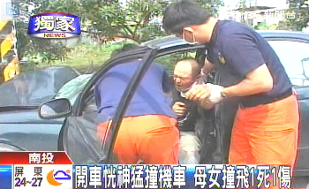 中新網(wǎng)3月4日電 據(jù)臺(tái)灣TVBS報(bào)道,南投縣草屯今天發(fā)生一起死亡車禍,轎車駕駛疑似恍神,直接撞上騎摩托車雙載的母女,車被撞飛了10米遠(yuǎn),坐在后座的媽媽雖然有戴安全帽,但因?yàn)樗は萝嚂r(shí),被轎車撞上頭部,當(dāng)場(chǎng)傷重不治。