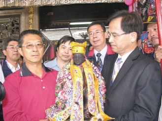 臺(tái)南縣學(xué)甲慈濟(jì)宮開基保生二大帝安南巡禮,800多年歷史的神像由縣長蘇煥智(右一)、慈濟(jì)宮董事長周尚德(右二)請出。 聯(lián)合報(bào)圖