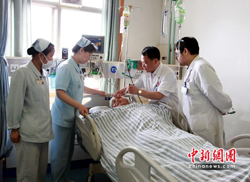中新網長沙5月6日電(劉柱 伍西明)“多虧醫(yī)院救了我丈夫的命,歡迎你們來臺灣做客!”在湖南湘雅醫(yī)院重癥醫(yī)學科(ICU病房),剛剛從臺灣趕來長沙的臺胞患者梁登輝的夫人對病房里的醫(yī)生和護士們連聲感謝。