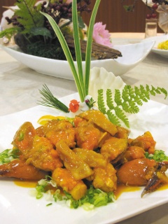 呂文芳首推10道經(jīng)典菜,其中幾近失傳的豆乳蟳,是早期文華莊出名的招牌菜,要讓苦瓜的苦味不滲入蟹肉里,卻又得讓豆腐乳的甘醇融于苦瓜與蟹肉中,還有手工菜菊花燕窩、旦黃大蝦、桂花魚翅等。過去北投各酒家的傳奇菜蓬萊排骨酥,是當?shù)啬ν熊噷K椭粮骶萍业闹该戮撇耍缃褚苍俣戎噩F(xiàn)。
