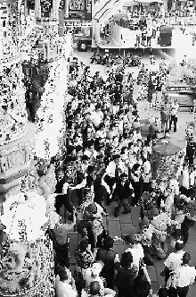 興濟(jì)宮還專設(shè)“宴王”,給予圣駕最高禮遇。數(shù)十平方米的大桌上有大龍蝦、烤乳豬等過百道各色食品。當(dāng)?shù)貙W(xué)生葉升融說起桌子正中最醒目的“山珍海味”,如數(shù)家珍,“用姜堆成的是‘山’,下面鋪著的紅豆綠豆代表了‘珍’,雪白的鹽就是‘!,‘味’則用紅糖表示!彼麑(duì)著“宴王”不斷按動(dòng)快門,說晚上就把照片傳到部落格上,和朋友們一起分享。 (記者 鄭璜 通訊員 林廣明)