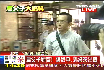 下午14時(shí)10分左右,陳致中一身輕便裝扮,準(zhǔn)時(shí)進(jìn)入臺(tái)北法院,準(zhǔn)備到第七法庭開庭。但是由于陳水扁早上的庭訊遲遲未能結(jié)束,所以直到15時(shí)47分左右,兩人才見(jiàn)到面。