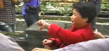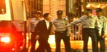 在法警的護(hù)送下,陳水扁身著黑西裝,手拿一份牛皮紙袋的資料,從臺北看守所出發(fā)乘警備車前往法院。下午5時40分,車隊抵達(dá)法院,陳水扁臉上帶著一抹淺淺的微笑,未戴手銬。