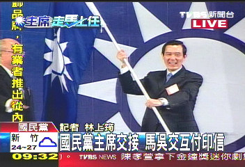中新網10月17日電 馬英九17日上午接任中國國民黨主席,與吳伯雄進行交接儀式,接下黨主席印信,傳承黨旗。