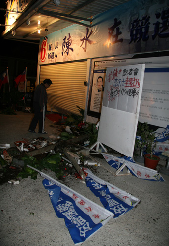 許敬民駕車撞陳水在競(jìng)選總部時(shí),總部鐵卷門已經(jīng)拉下,內(nèi)部無人,但將鐵卷門撞凹,門外的旗幟撞得東倒西歪,盆栽破碎一地。