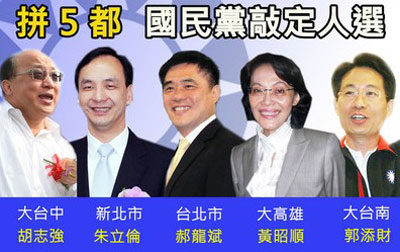國民黨中央提名審核委員會11日決定“五都”( 臺北縣升格后的新北市、臺北市、縣市合并后的大臺中市、大臺南市和大高雄市)征召人選,國民黨秘書長金溥聰宣布臺北市、新北市、大臺中、大臺南、大高雄分別征召臺北市長郝龍斌、“行政院副院長”朱立倫、臺中市長胡志強、前“立委”郭添財、“立委”黃昭順代表國民黨參選。
