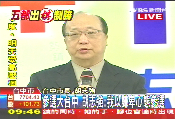 中新網(wǎng)5月13日 據(jù)臺灣TVBS電視臺報(bào)道,國民黨中常會(huì)昨天通過“五都”市長提名征召人選,藍(lán)營年底選戰(zhàn)五虎將正式就戰(zhàn)斗位置。爭取大臺中市長的胡志強(qiáng),今日上午召開記者會(huì),正式對大臺中市民表態(tài)參選。他表示將以最謙卑的心情,來參選大臺中市長。