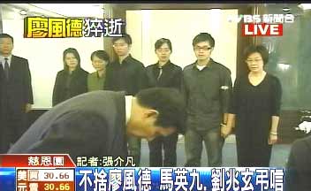 據(jù)臺(tái)灣TVBS報(bào)道,廖風(fēng)德因病猝逝可謂“驟失英才”,讓人措手不及,他的家人在慈恩園為他布置靈堂,在今天上午10點(diǎn)開(kāi)始讓親友吊唁,面色凝重的馬英九、準(zhǔn)“行政院長(zhǎng)”劉兆玄、“立委”蔣孝嚴(yán)也來(lái)到靈堂送他最后一程。