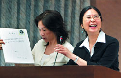 蔡煌瑯質詢時間已超過很久,又冷不防說了一句,“你有沒有發(fā)現主席(李嘉進)讓我繼續(xù)質詢你?”頓時引來哄堂大笑,蔡補一句說,“你知道在國民黨的處境了哦!幸媛姐,回來吧,回來中心思想吧,那個位置很燙啦!很燙啦!”經過一整天的炮火轟炸,“兩岸人民關系條例修正草案”順利通過初審,賴幸媛也明顯地松了口氣。