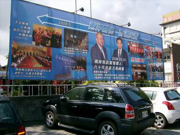 中新網(wǎng)8月28日電 據(jù)臺灣“中廣新聞”報道,國民黨臺東縣黨部27日在大門前懸掛黨主席吳伯雄與中共中央總書記胡錦濤握手的照片,以及訴求主題為“兩岸關(guān)系、雨過天青”的巨幅文宣廣告牌,相當(dāng)引人注目。