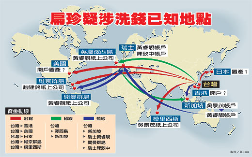 中新網(wǎng)8月30日電 據(jù)臺灣《聯(lián)合報》報道,臺灣“最高檢“特偵組追查陳水扁家庭海外密帳,發(fā)現(xiàn)陳水扁家的資金,曾在臺灣以外至少四大洲的十個國家或地區(qū)流轉,包括被視為洗錢天堂的英屬開曼群島、澤西島等地,金額疑超過十億元(新臺幣,下同);檢方認為陳水扁家在日本、美國也有資產(chǎn),正過濾、查證相關情資。
