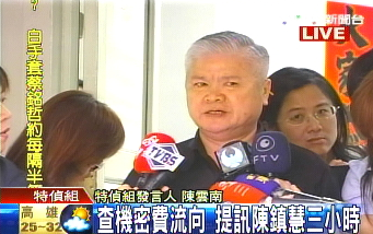 特偵組發(fā)言人陳云南表示,借提陳水扁任內出納陳鎮(zhèn)慧、前陳水扁辦公室主任林德訓出庭,最主要是要厘清整個機要費的流向以及金額細節(jié)部分。(圖片來源:臺灣TVBS)