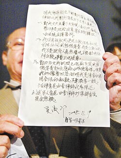 律師李勝雄走出寶徠代吳淑珍發(fā)表三點(diǎn)聲明的親筆簽名。(姚志平攝)