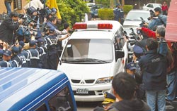 遭羈押因禁食而戒護送醫(yī)的陳水扁經(jīng)3天療養(yǎng)后,19日下午1點從板橋醫(yī)院還押臺北看守所,車道兩旁的媒體隔著大批維安警察搶拍救護車內(nèi)的阿扁。(王錦河攝)