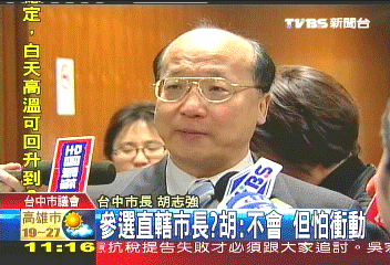 中新網11月21日電 據(jù)臺灣TVBS報道,2010年臺中縣市將合并“升格”為“直轄市”,到底臺中市長胡志強會不會參選“直轄市長”?胡志強表示,他理性、平和、冷靜的跟大家說,他不會參選,但就怕大家逼他,讓他太沖動,此話一出,又讓大家留有想象空間。