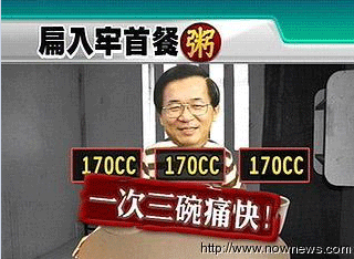 中新網(wǎng)11月28日電 據(jù)臺(tái)灣“今日新聞”報(bào)道,身陷洗錢疑云的陳水扁遭收押后即以禁食抗議,不過,昨天(27日)晚間已恢復(fù)進(jìn)食,不但喝了500毫升的粥,還吃了一顆水煮蛋。國(guó)民黨“立委”邱毅諷陳水扁說,別一口氣吃太多,以免“瀉肚”。