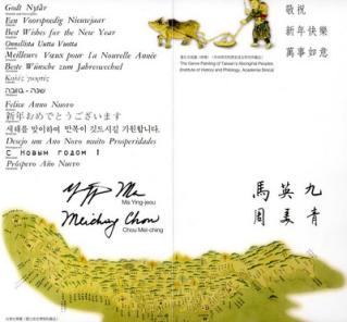 馬英九伉儷新年賀卡18日出爐,內(nèi)頁(yè)挑選橫躺的臺(tái)灣古輿圖以及水牛耕種圖做為圖樣。(臺(tái)灣“中央社”圖)