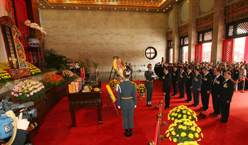 清明節(jié)將屆,“中樞遙祭黃帝陵典禮”上午在圓山忠烈祠舉行,馬英九親率文武百官參與,遵循上香、獻(xiàn)花、三鞠躬禮等儀式,遙祭黃帝陵,“行政院長”劉兆玄、“司法院長”賴英照等出席陪祭,典禮莊嚴(yán)肅穆。