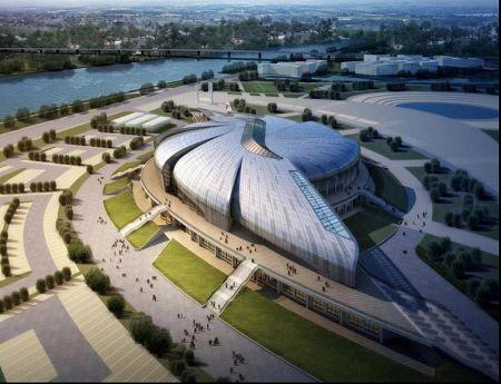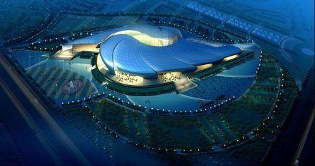 南沙體育館是亞運會武術(shù)比賽場館,因此在設(shè)計上場館也體現(xiàn)了中國武術(shù)的意境。南沙體育館的外殼分九個曲面單元,單元間片片層疊,并分為南北兩組以比賽大廳圓心為中心呈螺旋放射狀展開。這種富有動感的設(shè)計隱喻了中國武術(shù)的最高境界——“陰陽俱合,天人合一”。同時結(jié)合廣東海洋文化的特征,借鑒了富有肌理變化的“海螺”外殼作為造型設(shè)計的意向。南沙體育館主體鋼結(jié)構(gòu)部分采用了雙層環(huán)形張弦穹頂結(jié)構(gòu),主跨度達(dá)到了98米。