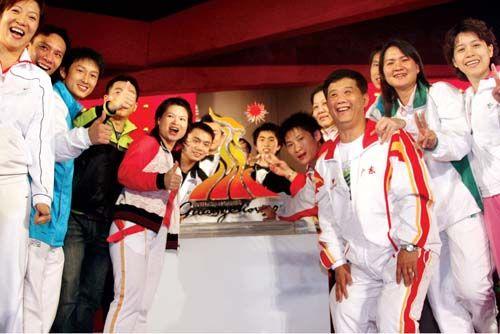 廣東著名體育人士在揭曉的第16屆亞運會會徽的展板前留影