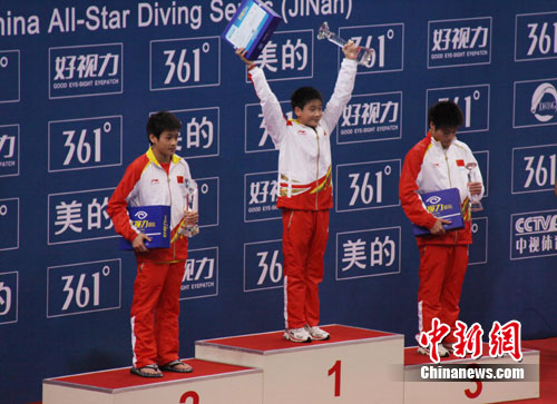 中新社濟(jì)南9月18日電 (張譯文)2010—2011中國(guó)跳水明星系列賽第二站的比賽18日晚繼續(xù)在濟(jì)南舉行。在剛剛結(jié)束的男子10米跳臺(tái)決賽中,北京選手曹緣憑借完美發(fā)揮獲得105.45高分奪得冠軍,亞軍、季軍分別被來(lái)自廣東的張雁全和上海的火亮獲得。